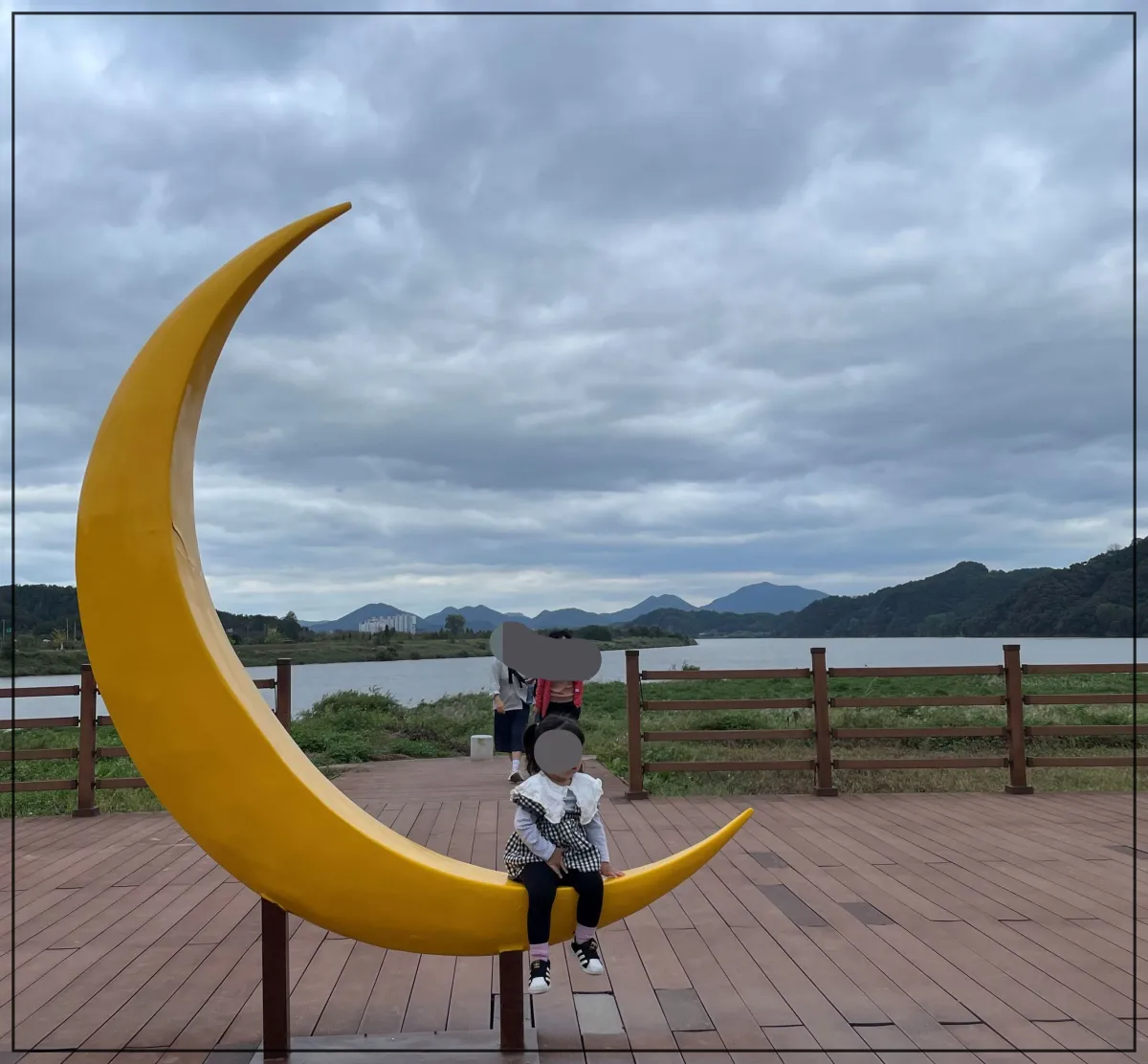 아이들이 움직여서 대충 찍었지만, 뒤에 흐르는 강과 달조형물이 너무 이쁘게 나옵니다.