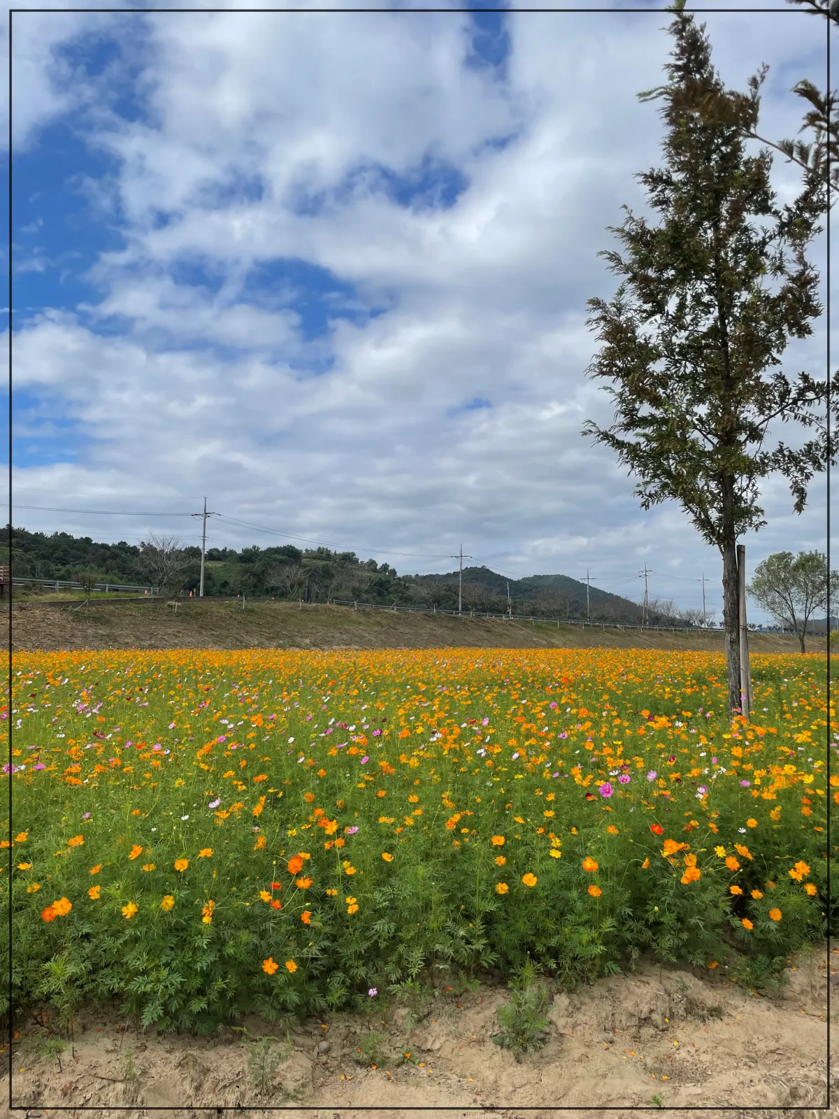 코스모스 하면 핑크색만 떠올렸는데, 노란색, 주황색, 보라색, 흰색 여러 가지 색이 어울리니 훨씬 다채롭고 이쁘더라고요.