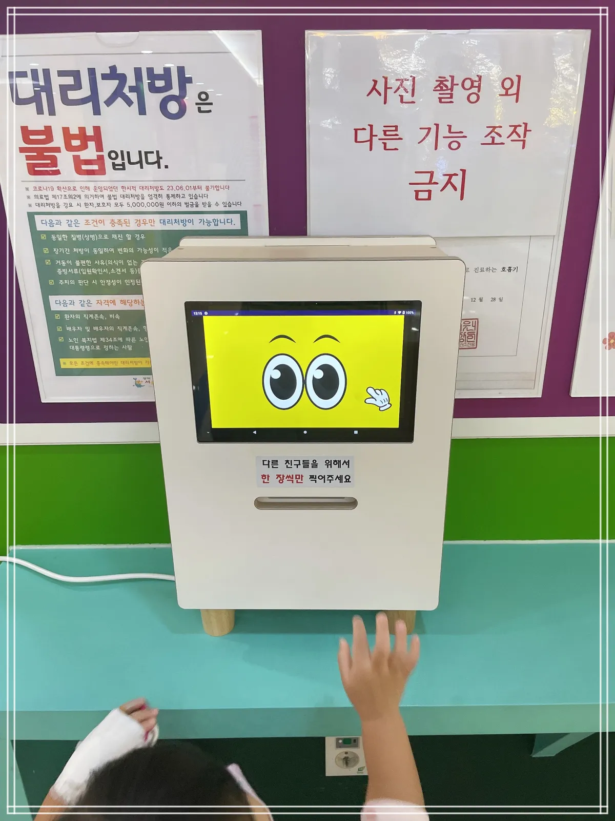 새로운 기계가 왔어요~ 영수증 같은 종이에 사진이 인쇄되어 나오는 카메라. 저희딸 계속 누르려고 해서 시껍했습니다.