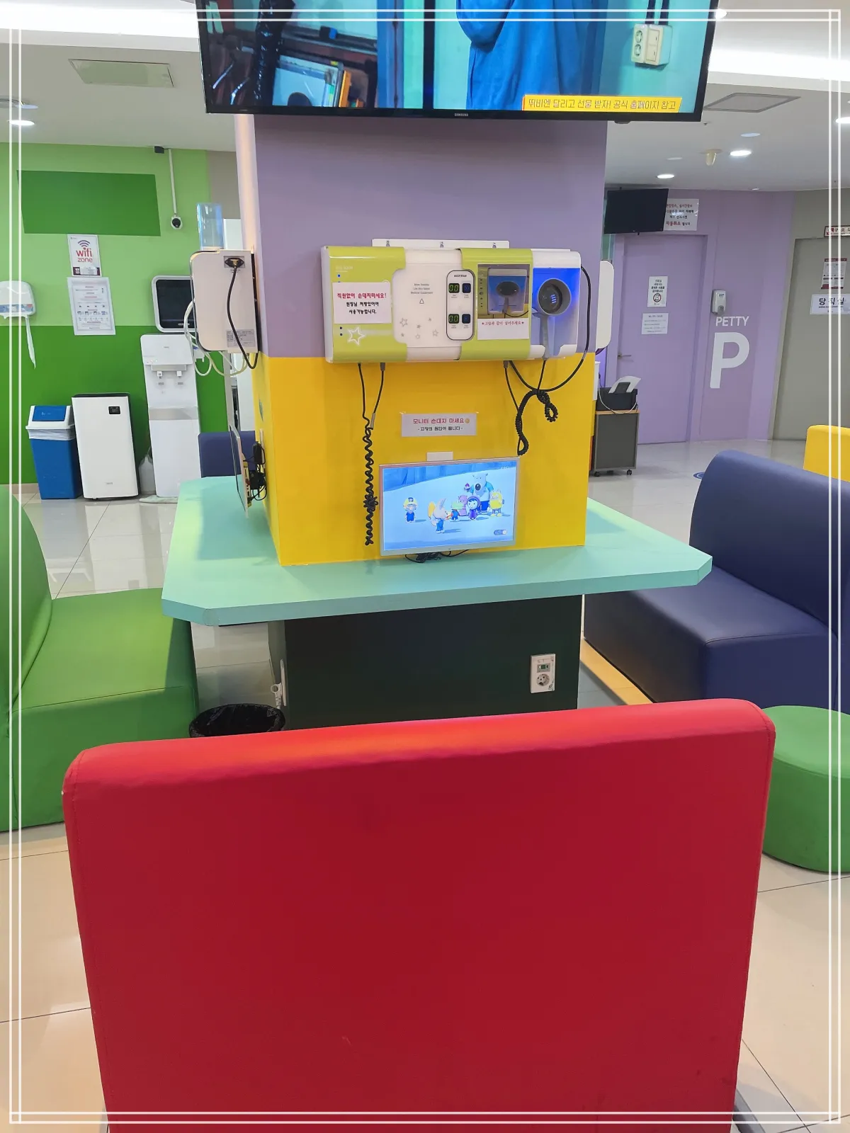 호흡기 치료, 중이염 치료 공간으로 집중 못하는 어린이들 앉아있게 해주는 모니터.