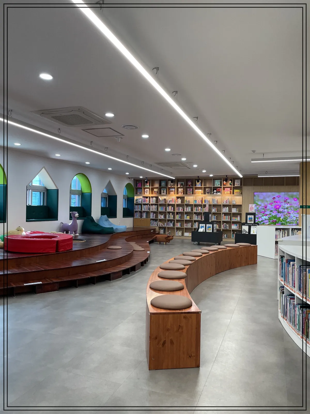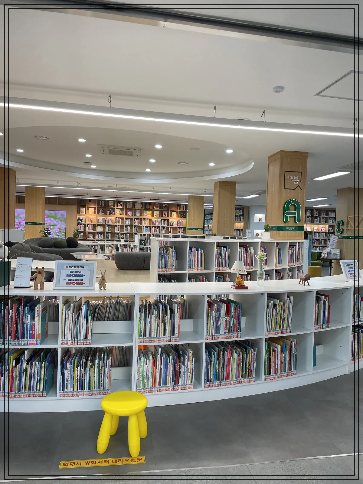 1층, 어린이 도서, 누워서, 기대서 자유롭게 상상의 나래를 펼쳐라.